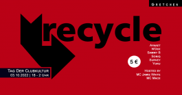 'Recycle - Berlin's finest Drum'n'Bass' ist mit 26 Jahren die wohl längste existierende und regelmäßig stattfindende Drum'n'Bass-Reihe Europas (und vermutlich auch weltweit). Neben unseren eigenen Residents laden wir hier Akteure anderer Berliner DnB-Crews sowie internationale Acts dazu.
